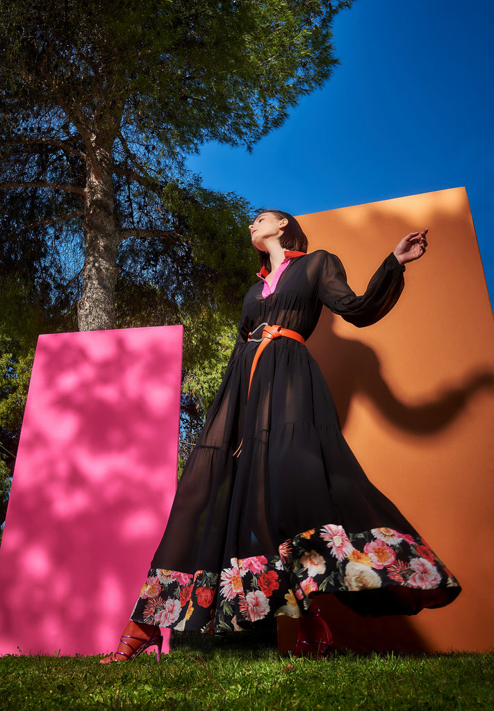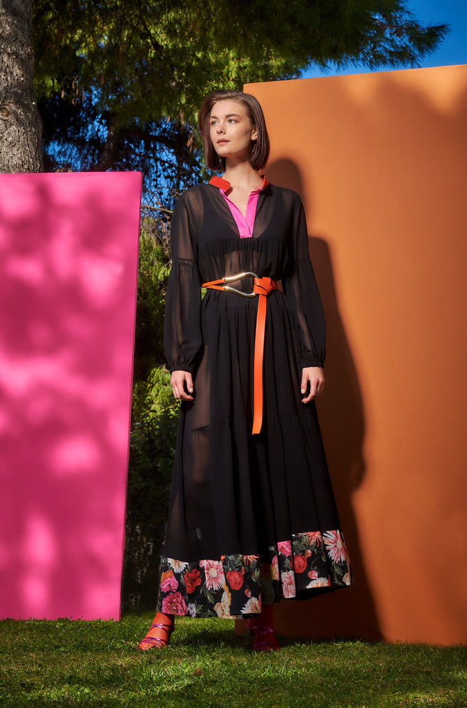 ΦΟΡΕΜΑ MAXI ΤΟΥΛΙ ΜΕ ΔΙΧΡΩΜΗ ΤΡΕΣΑ ΣΤΟ ΠΕΤΟ ΚΑΙ FLORAL ΤΡΕΣΑ ΣΤΟ ΤΕΛΕΙΩΜΑ