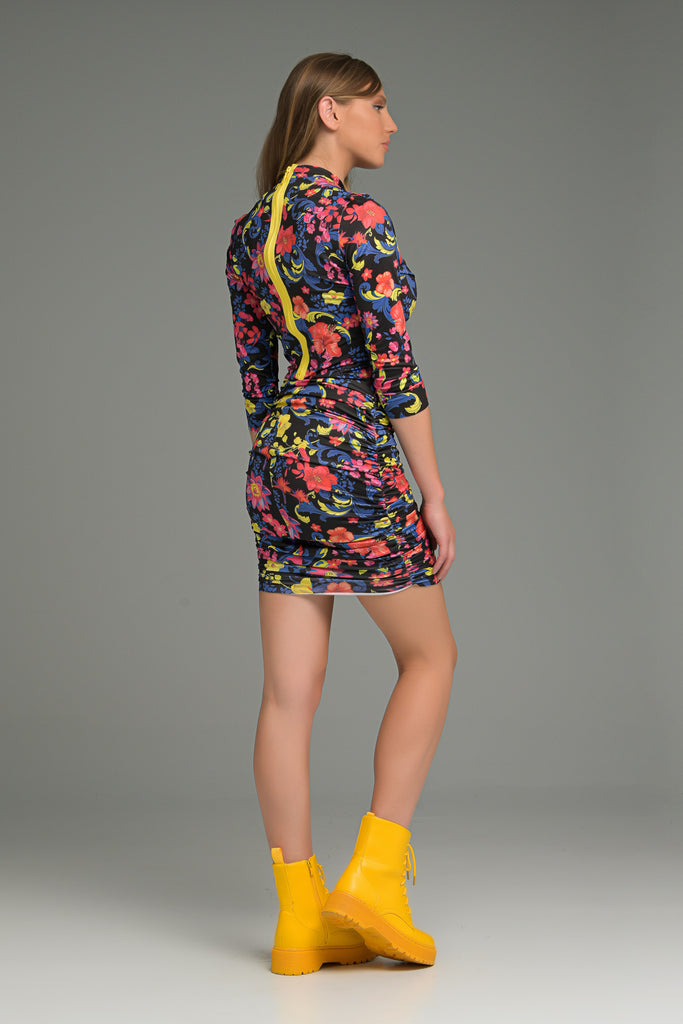 CLOSE-FITTING CUT GATHERED DRESS IN FLORAL PRINT WITH STAND COLAR